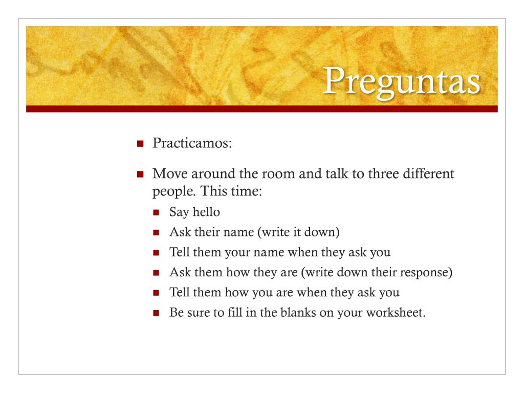 Preguntas • Practicamos: • Move around the room and talk to three different people. This time: • Say hello • Ask their name (write it down) • Tell them your name when they ask you • Ask them how they are (write down their response) • Tell them how you are when they ask you • Be sure to fill in the blanks on your worksheet.