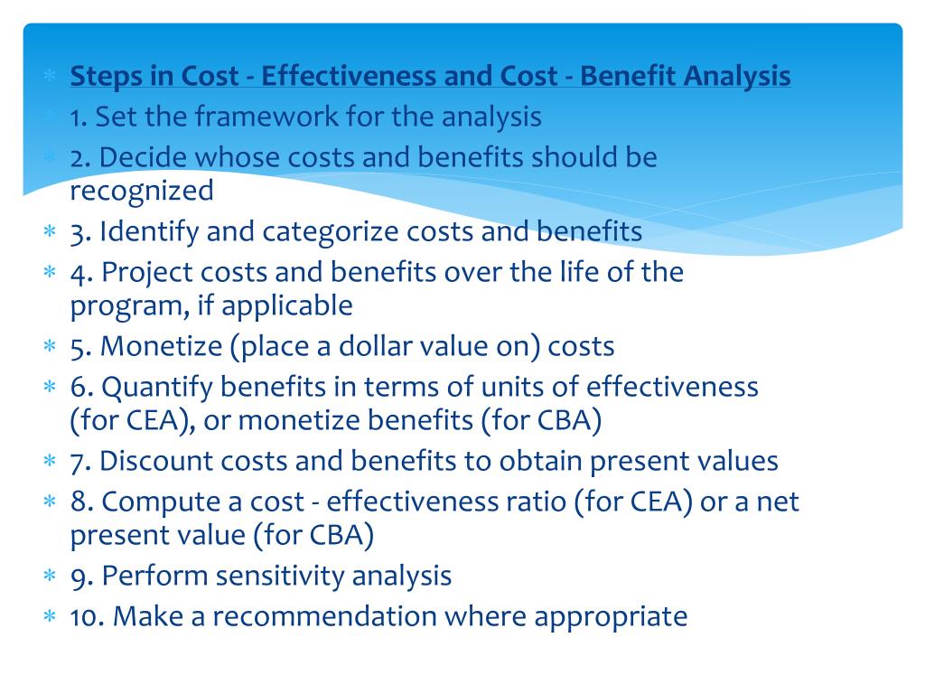 Steps in Cost - Effectiveness and Cost - Benefit Analysis 1. Set the framework for the analysis 2. Decide whose costs and benefits should be recognized 3. Identify and categorize costs and benefits 4. Project costs and benefits over the life of the program, if applicable 5. Monetize (place a dollar value on) costs 6. Quantify benefits in terms of units of effectiveness (for CEA), or monetize benefits (for CBA) 7. Discount costs and benefits to obtain present values 8. Compute a cost - effectiveness ratio (for CEA) or a net present value (for CBA) 9. Perform sensitivity analysis 10. Make a recommendation where appropriate