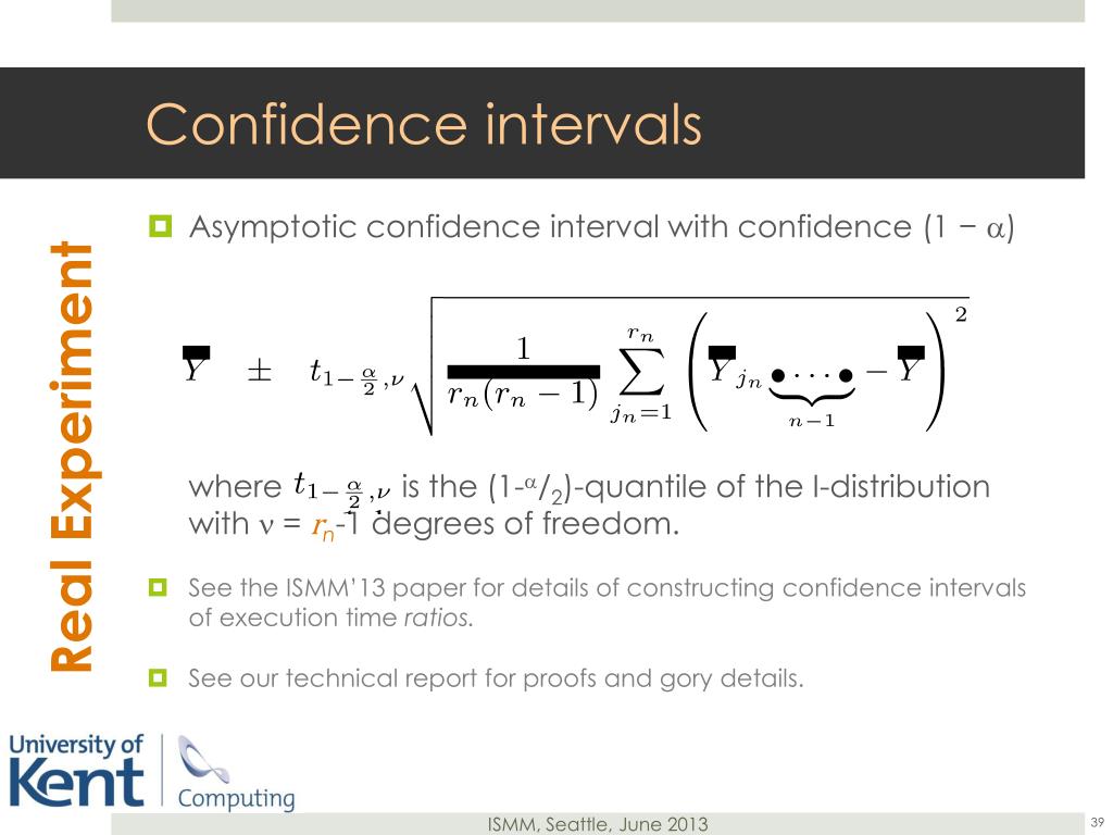 Asymptotic confidence interval with confidence (1 − a) where is the (1-a/2)-quantile of the I-distribution with n = rn-1 degrees of freedom. See the ISMM’13 paper for details of constructing confidence intervals of execution time ratios. See our technical report for proofs and gory details. Confidence intervals Real Experiment