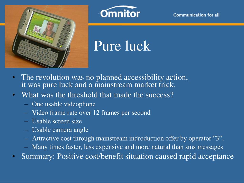 Pure luck • The revolution was no planned accessibility action, it was pure luck and a mainstream market trick. • What was the threshold that made the success? • One usable videophone • Video frame rate over 12 frames per second • Usable screen size • Usable camera angle • Attractive cost through mainstream indroduction offer by operator ”3”. • Many times faster, less expensive and more natural than sms messages • Summary: Positive cost/benefit situation caused rapid acceptance