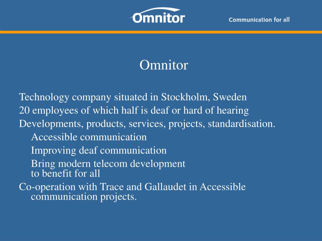 Omnitor Technology company situated in Stockholm, Sweden 20 employees of which half is deaf or hard of hearing Developments, products, services, projects, standardisation. Accessible communication Improving deaf communication Bring modern telecom developmentto benefit for all Co-operation with Trace and Gallaudet in Accessible communication projects.