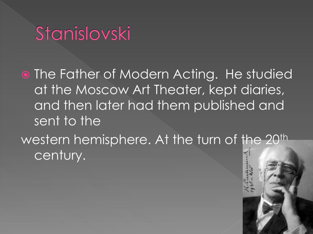 Stanislovski • The Father of Modern Acting. He studied at the Moscow Art Theater, kept diaries, and then later had them published and sent to the western hemisphere. At the turn of the 20th century.