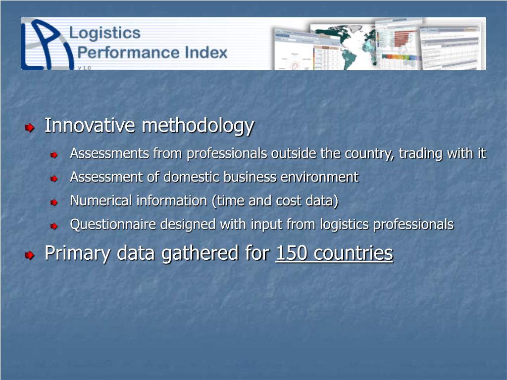 Innovative methodology • Assessments from professionals outside the country, trading with it • Assessment of domestic business environment • Numerical information (time and cost data) • Questionnaire designed with input from logistics professionals • Primary data gathered for 150 countries