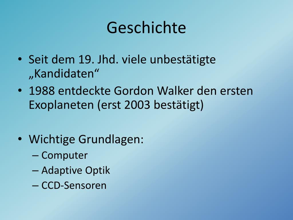 Geschichte • Seit dem 19. Jhd. viele unbestätigte „Kandidaten“ • 1988 entdeckte Gordon Walker den ersten Exoplaneten (erst 2003 bestätigt) • Wichtige Grundlagen: • Computer • Adaptive Optik • CCD-Sensoren