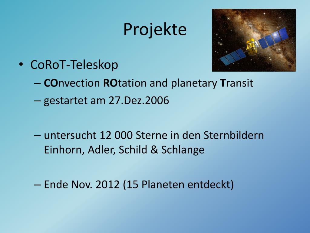 Projekte • CoRoT-Teleskop • COnvectionROtationandplanetaryTransit • gestartet am 27.Dez.2006 • untersucht 12 000 Sterne in den Sternbildern Einhorn, Adler, Schild & Schlange • Ende Nov. 2012 (15 Planeten entdeckt)