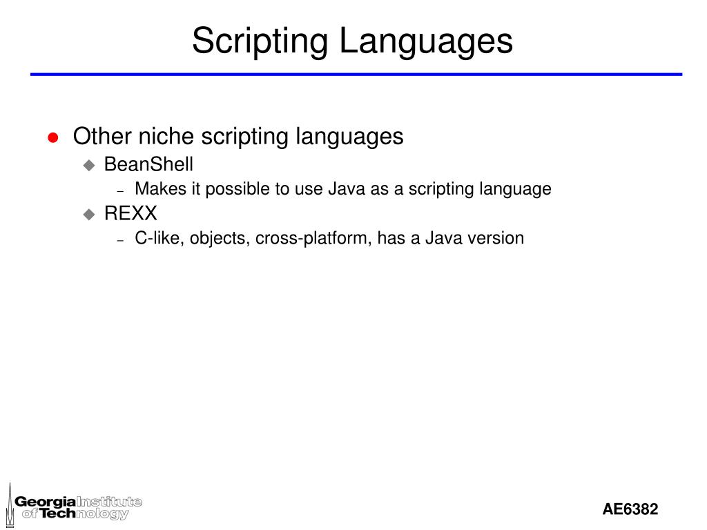Introduction to Scripting. AE 6382. What is a scripting. Scripting is the process of programming using a scripting language A scripting language, like C, Fortran, and Java, has expressions, conditional statements, and loop statements. Unlike C, Fortran, and Java a scripting language has