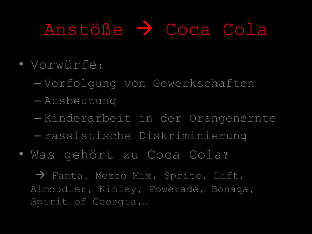 Anstöße Coca Cola • Vorwürfe: • Verfolgung von Gewerkschaften • Ausbeutung • Kinderarbeit in der Orangenernte • rassistische Diskriminierung • Was gehört zu Coca Cola? Fanta, Mezzo Mix, Sprite, Lift, Almdudler, Kinley, Powerade, Bonaqa, Spirit of Georgia,…