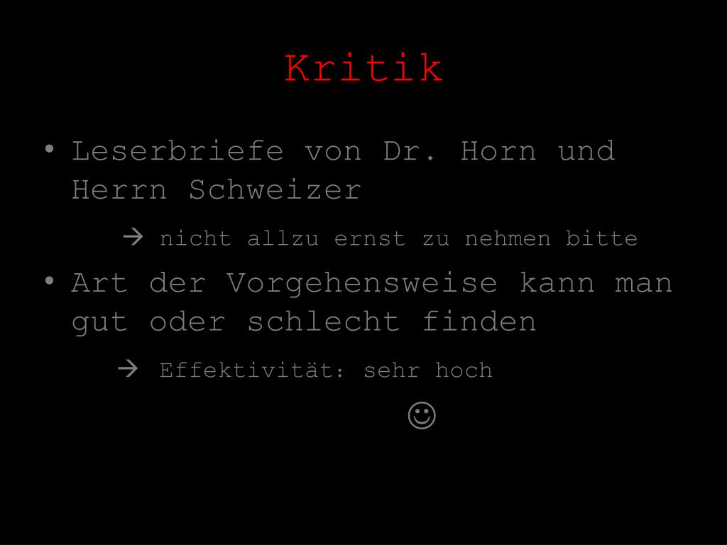Kritik • Leserbriefe von Dr. Horn und Herrn Schweizer nicht allzu ernst zu nehmen bitte • Art der Vorgehensweise kann man gut oder schlecht finden Effektivität: sehr hoch