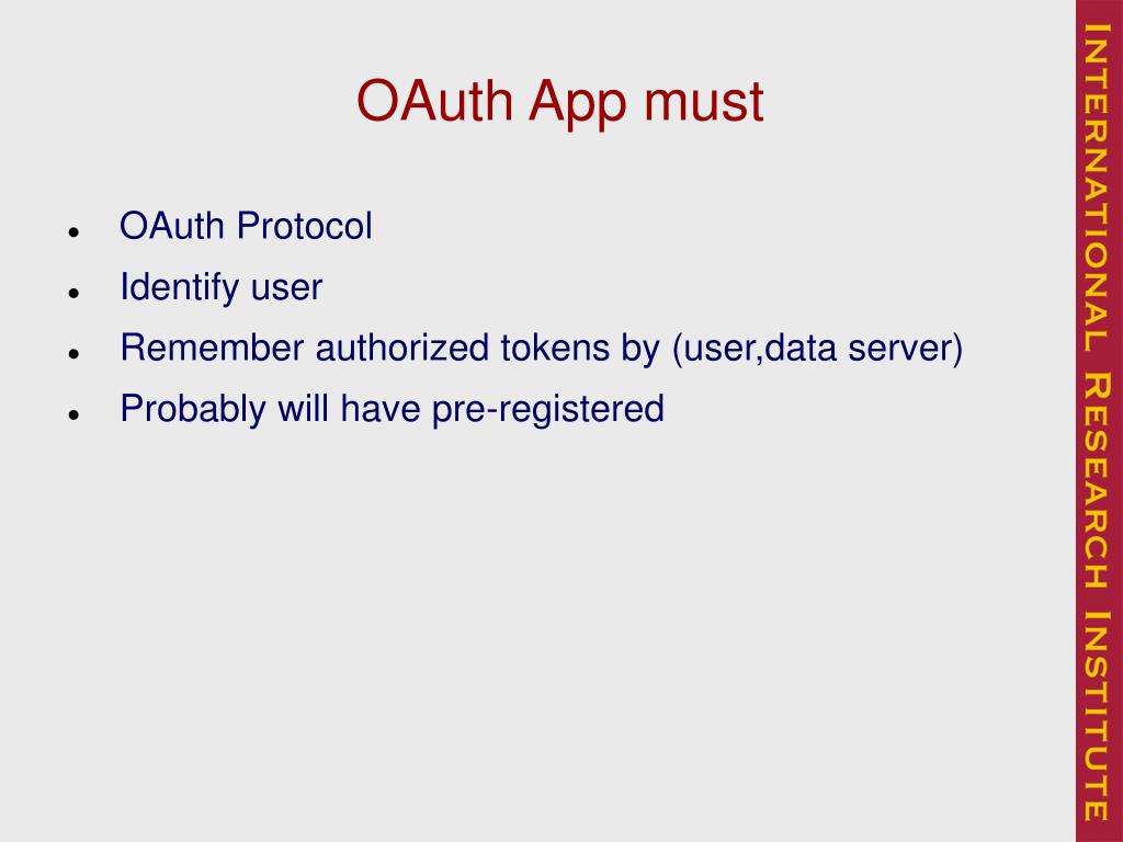 OAuth App must • OAuth Protocol • Identify user • Remember authorized tokens by (user,data server) • Probably will have pre-registered
