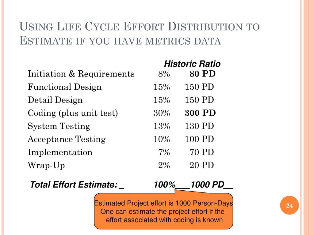 Using Life Cycle Effort Distribution to Estimate if you have metrics data Initiation & Requirements 8% 80 PD Functional Design 15% 150 PD Detail Design 15% 150 PD Coding (plus unit test) 30% 300 PD System Testing 13% 130 PD Acceptance Testing 10% 100 PD Implementation 7% 70 PD Wrap-Up 2% 20 PD Historic Ratio Total Effort Estimate: _ 100%___1000 PD__ Estimated Project effort is 1000 Person-Days One can estimate the project effort if the effort associated with coding is known