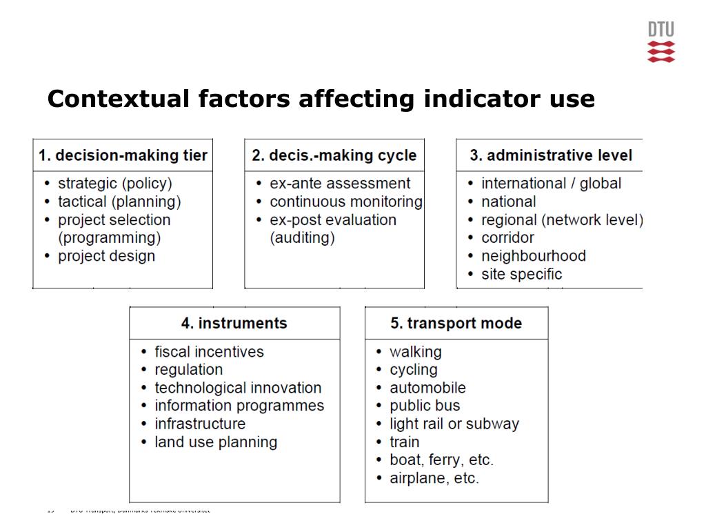Representation Validity Reliability Sensitivity Operation Measurability Data availability Ethical concerns Intervention Transparency Interpretability Target relevance Actionability 10 criteria in three categories Representation related criteria: Indicators assessed with regard to their accurate representationof an impact (as accurate as possible and necessary) Operation related criteria: Indicators assessed with regard to how operational they are for practical assessment and continued monitoring Intervention related criteria: Indicators assessed for their pertinence to and usefulness for policy and management decision making applications Adapted from : Joumard & Gudmundsson 2010