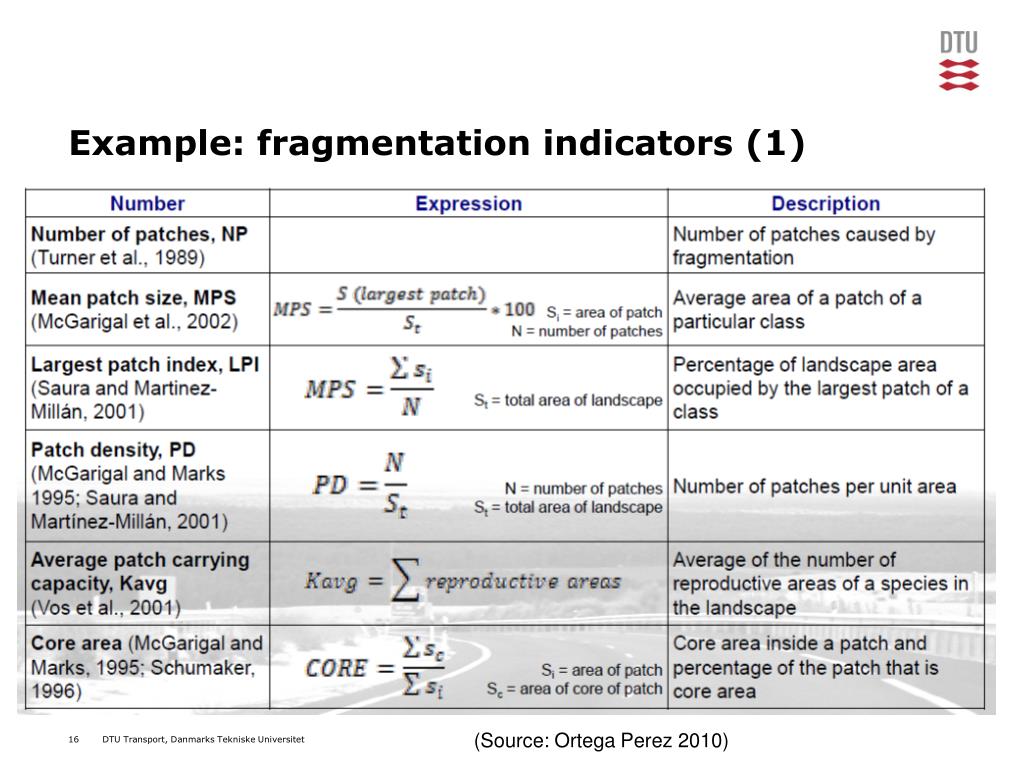 Example: fragmentation indicators (1) (Source: Ortega Perez 2010)