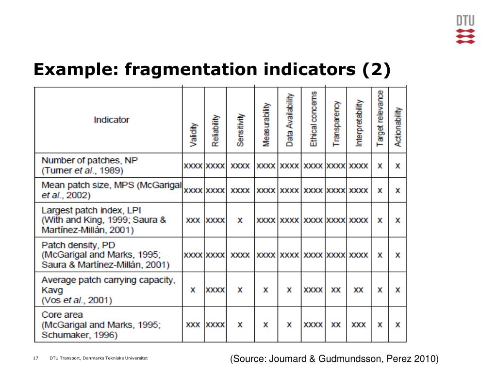 Example: fragmentation indicators (2) (Source: Joumard & Gudmundsson, Perez 2010)
