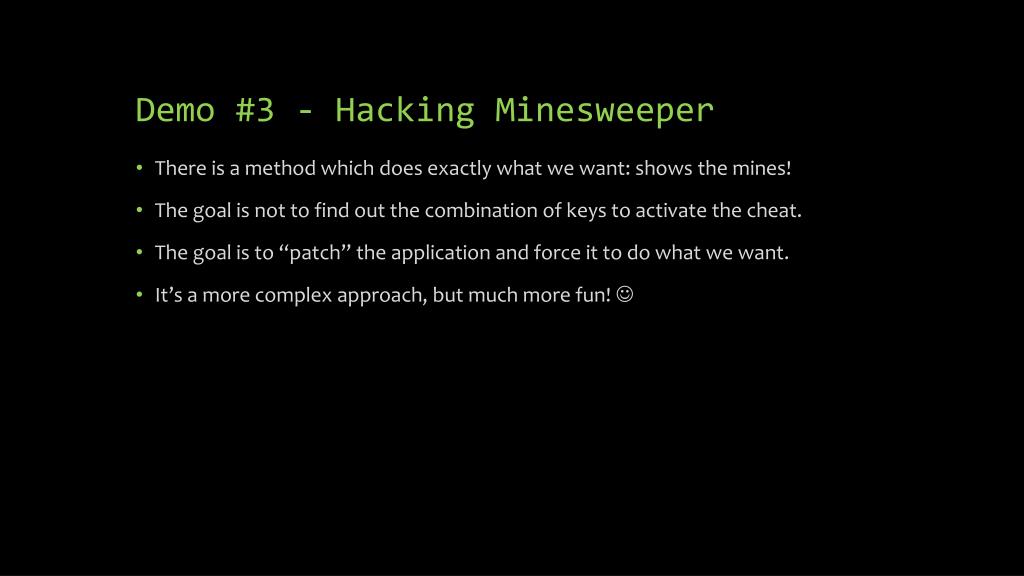 Demo #3 - Hacking Minesweeper • There is a method which does exactly what we want: shows the mines! • The goal is not to find out the combination of keys to activate the cheat. • The goal is to “patch” the application and force it to do what we want. • It’s a more complex approach, but much more fun!
