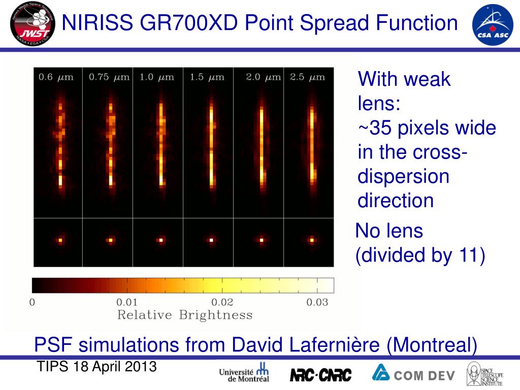NIRISS GR700XD Point Spread Function With weak lens: ~35 pixels wide in the cross-dispersion direction No lens (divided by 11) PSF simulations from David Lafernière (Montreal) TIPS 18 April 2013