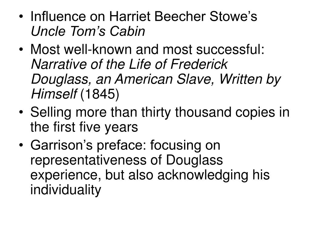 Influence on Harriet Beecher Stowe’s Uncle Tom’s Cabin • Most well-known and most successful: Narrative of the Life of Frederick Douglass, an American Slave, Written by Himself (1845) • Selling more than thirty thousand copies in the first five years • Garrison’s preface: focusing on representativeness of Douglass experience, but also acknowledging his individuality