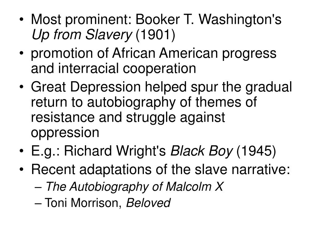 Most prominent: Booker T. Washington's Up from Slavery (1901) • promotion of African American progress and interracial cooperation • Great Depression helped spur the gradual return to autobiography of themes of resistance and struggle against oppression • E.g.: Richard Wright's Black Boy (1945) • Recent adaptations of the slave narrative: • The Autobiography of Malcolm X • Toni Morrison, Beloved