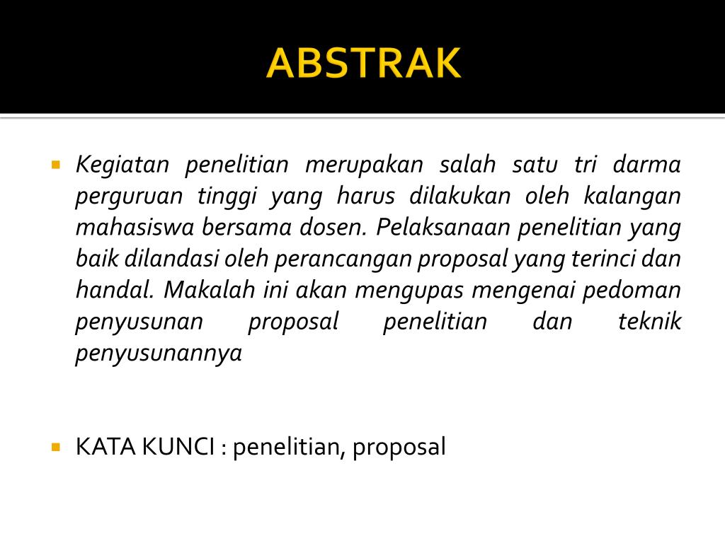 ABSTRAK • Kegiatanpenelitianmerupakansalahsatu tri darmaperguruantinggi yang harusdilakukanolehkalanganmahasiswabersamadosen. Pelaksanaanpenelitian yang baikdilandasiolehperancangan proposal yang terincidanhandal. Makalahiniakanmengupasmengenaipedomanpenyusunan proposal penelitiandanteknikpenyusunannya • KATA KUNCI : penelitian, proposal
