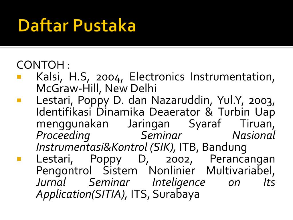 DaftarPustaka CONTOH : • Kalsi, H.S, 2004, Electronics Instrumentation, McGraw-Hill, New Delhi • Lestari, Poppy D. danNazaruddin, Yul.Y, 2003, IdentifikasiDinamikaDeaerator & TurbinUapmenggunakanJaringanSyarafTiruan, Proceeding Seminar NasionalInstrumentasi&Kontrol (SIK), ITB, Bandung • Lestari, Poppy D, 2002, PerancanganPengontrolSistemNonlinierMultivariabel, Jurnal Seminar Inteligence on Its Application(SITIA), ITS, Surabaya