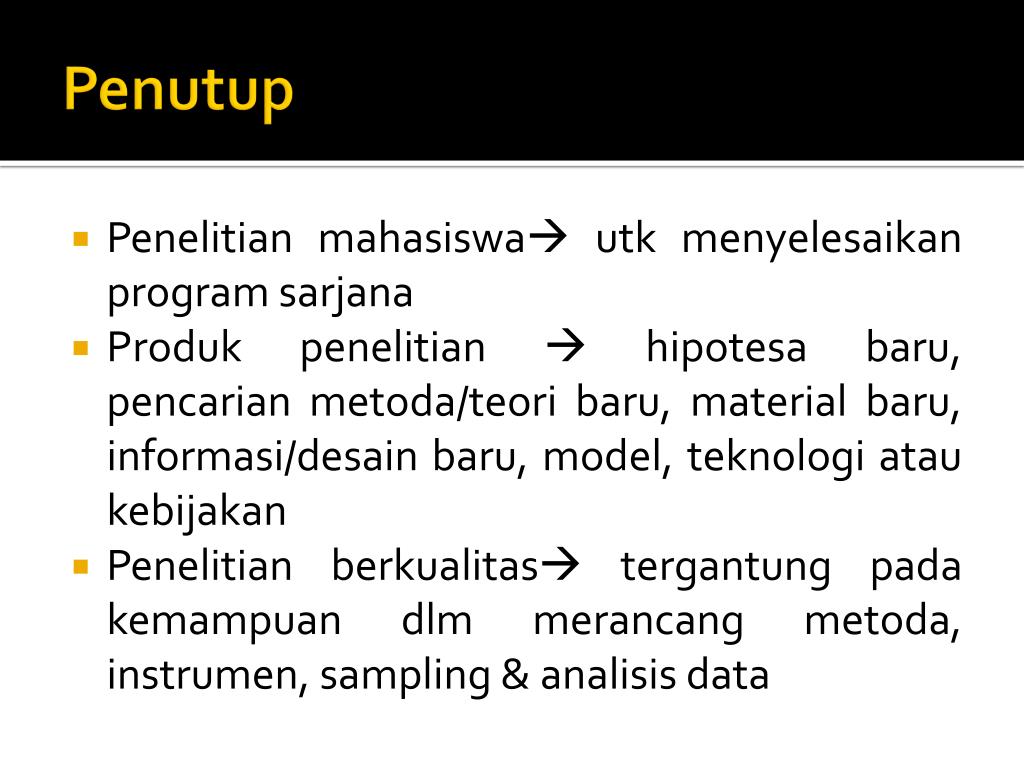 Penutup • Penelitianmahasiswa utkmenyelesaikan program sarjana • Produkpenelitian hipotesabaru, pencarianmetoda/teoribaru, material baru, informasi/desainbaru, model, teknologiataukebijakan • Penelitianberkualitas tergantungpadakemampuandlmmerancangmetoda, instrumen, sampling & analisis data