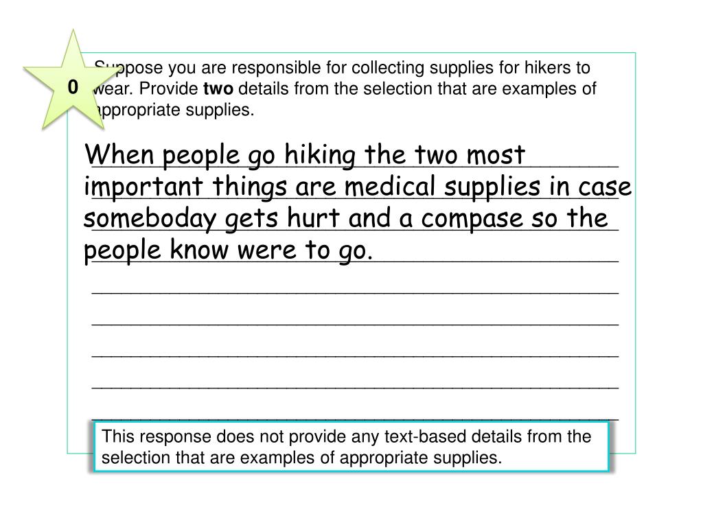 0 4 Suppose you are responsible for collecting supplies for hikers to wear. Provide two details from the selection that are examples of appropriate supplies. ______________________________________________________________________________________________________________________________________________________________________________________________________________________________________________________________________________________________________________________________________________________________________________________________________________________________________________________________________________________________________ When people go hiking the two most important things are medical supplies in case someboday gets hurt and a compase so the people know were to go. This response does not provide any text-based details from the selection that are examples of appropriate supplies.
