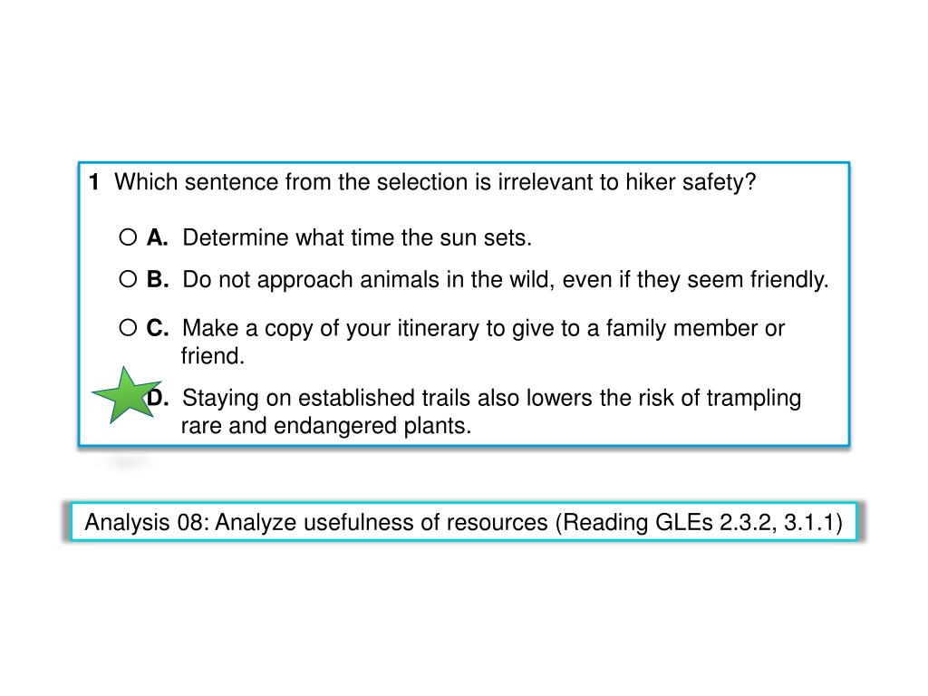 1Which sentence from the selection is irrelevant to hiker safety? • A. Determine what time the sun sets. • B. Do not approach animals in the wild, even if they seem friendly. • C. Make a copy of your itinerary to give to a family member or friend. • D. Staying on established trails also lowers the risk of trampling rare and endangered plants. Analysis 08: Analyze usefulness of resources (Reading GLEs 2.3.2, 3.1.1)