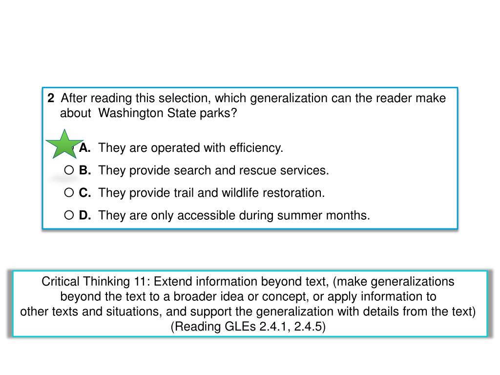 2 After reading this selection, which generalization can the reader make about Washington State parks? • A. They are operated with efficiency. • B. They provide search and rescue services. • C. They provide trail and wildlife restoration. • D. They are only accessible during summer months. Critical Thinking 11: Extend information beyond text, (make generalizations beyond the text to a broader idea or concept, or apply information to other texts and situations, and support the generalization with details from the text) (Reading GLEs 2.4.1, 2.4.5)
