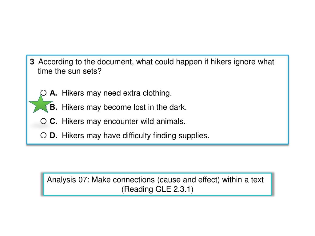 3 According to the document, what could happen if hikers ignore what time the sun sets? • A. Hikers may need extra clothing. • B. Hikers may become lost in the dark. • C. Hikers may encounter wild animals. • D. Hikers may have difficulty finding supplies. Analysis 07: Make connections (cause and effect) within a text (Reading GLE 2.3.1)