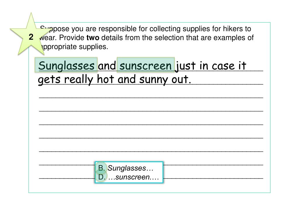 2 4 Suppose you are responsible for collecting supplies for hikers to wear. Provide two details from the selection that are examples of appropriate supplies. ______________________________________________________________________________________________________________________________________________________________________________________________________________________________________________________________________________________________________________________________________________________________________________________________________________________________________________________________________________________________________ Sunglasses and sunscreen just in case it gets really hot and sunny out. B. Sunglasses… D. …sunscreen.…