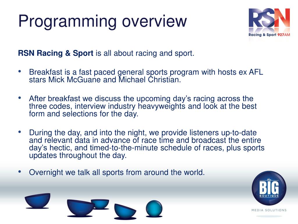 Programming overview RSN Racing & Sportis all about racing and sport. • Breakfast is a fast paced general sports program with hosts ex AFL stars Mick McGuane and Michael Christian. • After breakfast we discuss the upcoming day’s racing across the three codes, interview industry heavyweights and look at the best form and selections for the day. • During the day, and into the night, we provide listeners up-to-date and relevant data in advance of race time and broadcast the entire day’s hectic, and timed-to-the-minute schedule of races, plus sports updates throughout the day. • Overnight we talk all sports from around the world.
