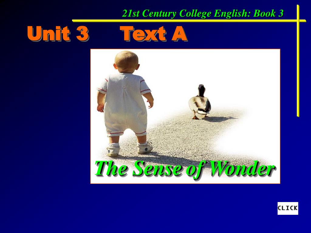The Sense. of Wonder. 21st Century College English: Book 3. Unit 3 Text A. Unit 3: Text A. Lead-in Activities Text Organization Reading and Writing Skills Language Points Guided Practice Assignments. The Sense of Wonder. Lead-in Activities. Warm-up Questions.