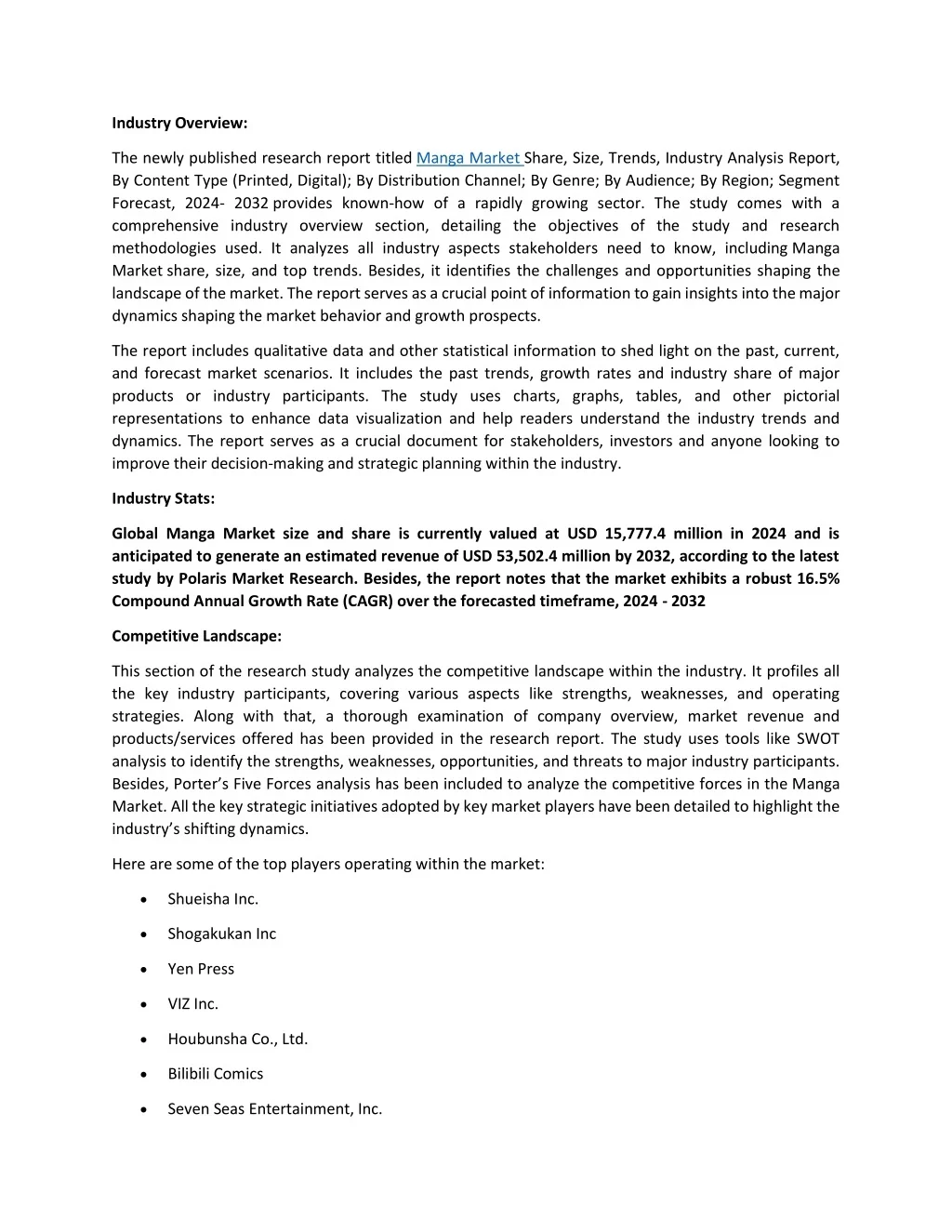 Industry Overview: The newly published research report titled Manga Market Share, Size, Trends, Industry Analysis Report, By Content Type (Printed, Digital); By Distribution Channel; By Genre; By Audience; By Region; Segment Forecast, 2024- 2032 provides known-how of a rapidly growing sector. The study comes with a comprehensive industry overview section, detailing the objectives of the study and research methodologies used. It analyzes all industry aspects stakeholders need to know, including Manga Market share, size, and top trends. Besides, it identifies the challenges and opportunities shaping the landscape of the market. The report serves as a crucial point of information to gain insights into the major dynamics shaping the market behavior and growth prospects. The report includes qualitative data and other statistical information to shed light on the past, current, and forecast market scenarios. It includes the past trends, growth rates and industry share of major products or industry participants. The study uses charts, graphs, tables, and other pictorial representations to enhance data visualization and help readers understand the industry trends and dynamics. The report serves as a crucial document for stakeholders, investors and anyone looking to improve their decision-making and strategic planning within the industry. Industry Stats: Global Manga Market size and share is currently valued at USD 15,777.4 million in 2024 and is anticipated to generate an estimated revenue of USD 53,502.4 million by 2032, according to the latest study by Polaris Market Research. Besides, the report notes that the market exhibits a robust 16.5% Compound Annual Growth Rate (CAGR) over the forecasted timeframe, 2024 - 2032 Competitive Landscape: This section of the research study analyzes the competitive landscape within the industry. It profiles all the key industry participants, covering various aspects like strengths, weaknesses, and operating strategies. Along with that, a thorough examination of company overview, market revenue and products/services offered has been provided in the research report. The study uses tools like SWOT analysis to identify the strengths, weaknesses, opportunities, and threats to major industry participants. Besides, Porter’s Five Forces analysis has been included to analyze the competitive forces in the Manga Market. All the key strategic initiatives adopted by key market players have been detailed to highlight the industry’s shifting dynamics. Here are some of the top players operating within the market: • Shueisha Inc. • Shogakukan Inc • Yen Press • VIZ Inc. • Houbunsha Co., Ltd. • Bilibili Comics • Seven Seas Entertainment, Inc.