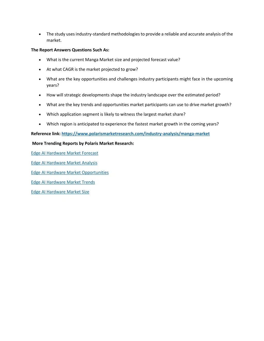 • The study uses industry-standard methodologies to provide a reliable and accurate analysis of the market. The Report Answers Questions Such As: • What is the current Manga Market size and projected forecast value? • At what CAGR is the market projected to grow? • What are the key opportunities and challenges industry participants might face in the upcoming years? • How will strategic developments shape the industry landscape over the estimated period? • What are the key trends and opportunities market participants can use to drive market growth? • Which application segment is likely to witness the largest market share? • Which region is anticipated to experience the fastest market growth in the coming years? Reference link: https://www.polarismarketresearch.com/industry-analysis/manga-market More Trending Reports by Polaris Market Research: Edge AI Hardware Market Forecast Edge AI Hardware Market Analysis Edge AI Hardware Market Opportunities Edge AI Hardware Market Trends Edge AI Hardware Market Size