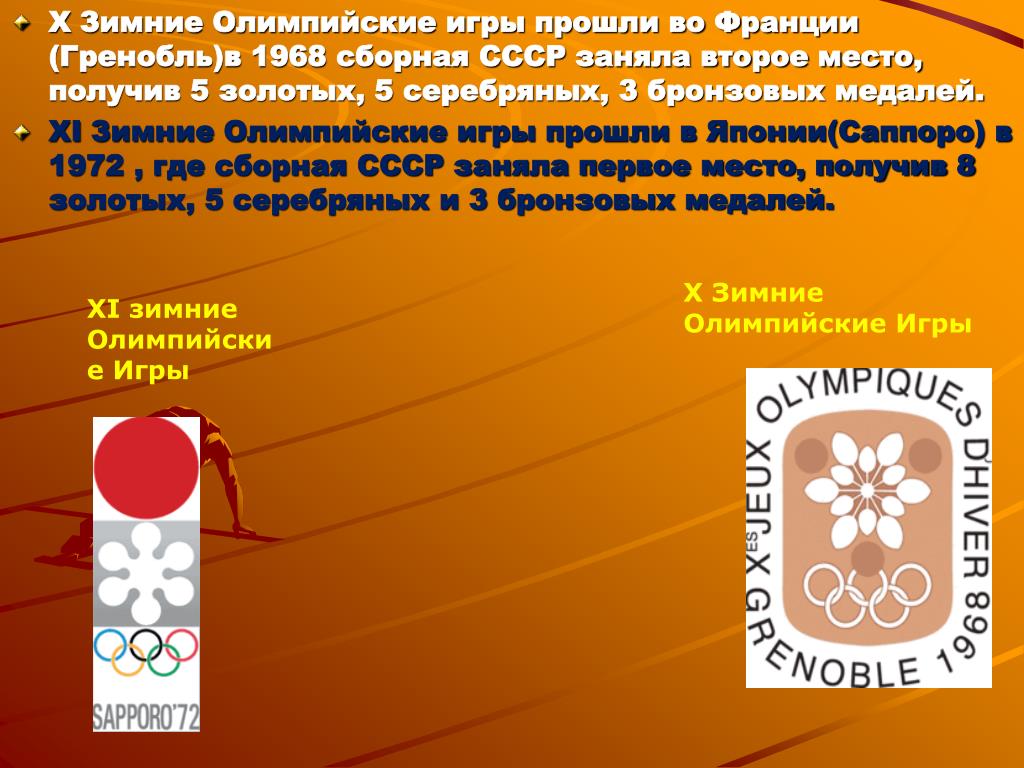 X Зимние Олимпийские игры прошли во Франции (Гренобль)в 1968 сборная СССР заняла второе место, получив 5 золотых, 5 серебряных, 3 бронзовых медалей. • XI Зимние Олимпийские игры прошли в Японии(Саппоро) в 1972 , где сборная СССР заняла первое место, получив 8 золотых, 5 серебряных и 3 бронзовых медалей. X Зимние Олимпийские Игры XI зимние Олимпийские Игры