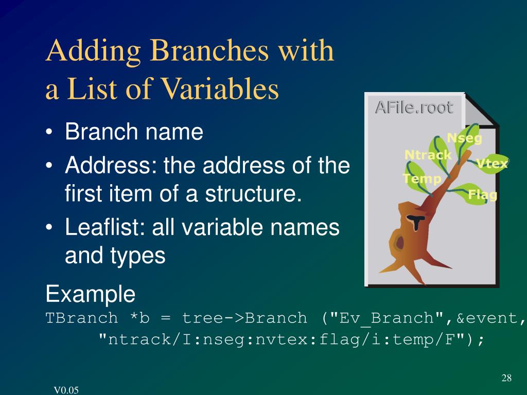 Splitting a Branch Setting the split level (default = 1) Split level = 0 Split level =1 Example: tree->Branch("EvBr","Event",&ev,64000,0); 27