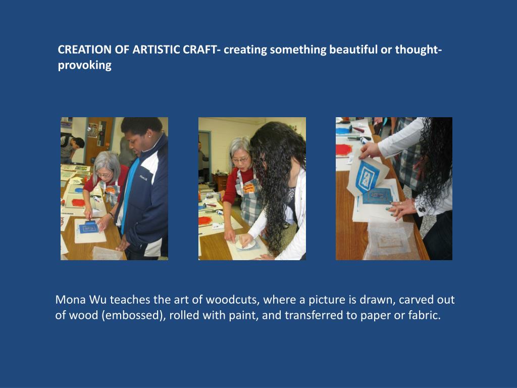 Creation of Artistic Craft- creating something beautiful or thought-provoking Mona Wu teaches the art of woodcuts, where a picture is drawn, carved out of wood (embossed), rolled with paint, and transferred to paper or fabric.