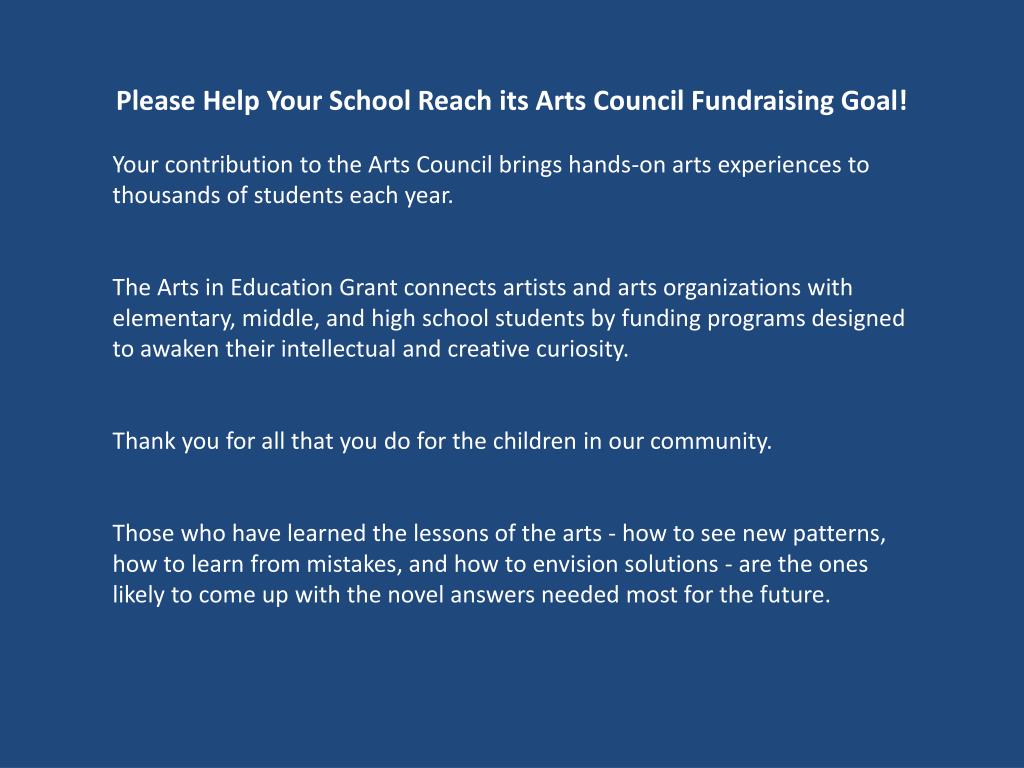Please Help Your School Reach its Arts Council Fundraising Goal! Your contribution to the Arts Council brings hands-on arts experiences to thousands of students each year. The Arts in Education Grant connects artists and arts organizations with elementary, middle, and high school students by funding programs designed to awaken their intellectual and creative curiosity. Thank you for all that you do for the children in our community. Those who have learned the lessons of the arts - how to see new patterns, how to learn from mistakes, and how to envision solutions - are the ones likely to come up with the novel answers needed most for the future.