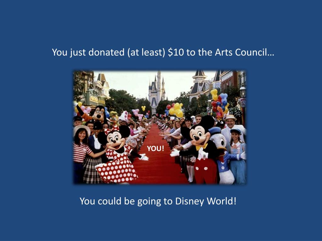 You just donated (at least) $10 to the Arts Council… YOU! You could be going to Disney World!