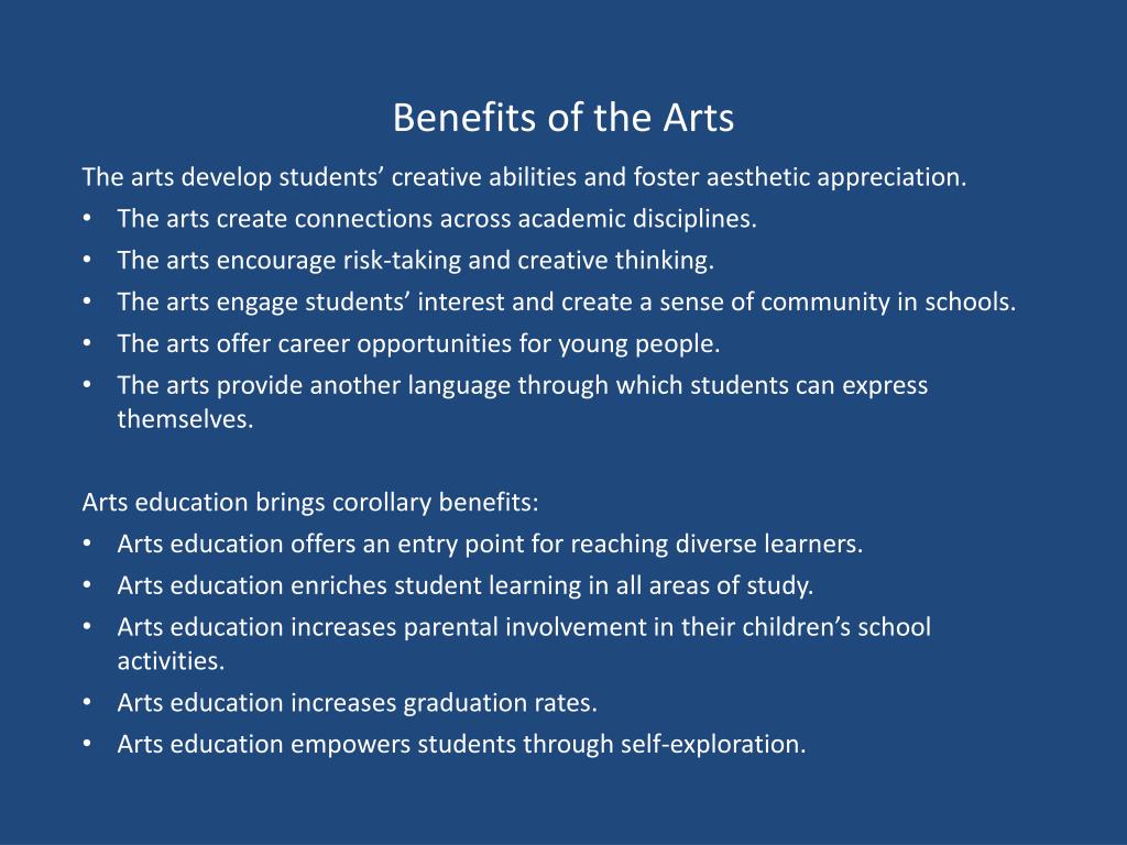 Benefits of the Arts • The arts develop students’ creative abilities and foster aesthetic appreciation. • The arts create connections across academic disciplines. • The arts encourage risk-taking and creative thinking. • The arts engage students’ interest and create a sense of community in schools. • The arts offer career opportunities for young people. • The arts provide another language through which students can express themselves. • Arts education brings corollary benefits: • Arts education offers an entry point for reaching diverse learners. • Arts education enriches student learning in all areas of study. • Arts education increases parental involvement in their children’s school activities. • Arts education increases graduation rates. • Arts education empowers students through self-exploration.