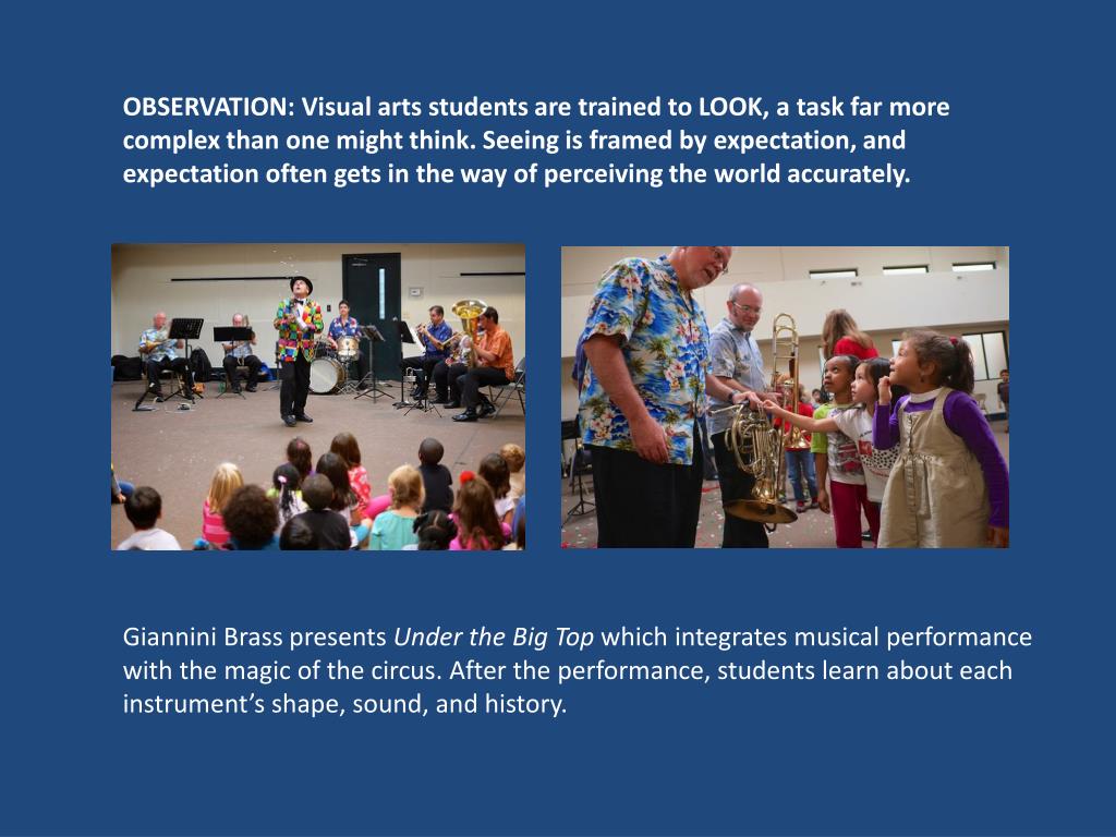 Observation: Visual arts students are trained to LOOK, a task far more complex than one might think. Seeing is framed by expectation, and expectation often gets in the way of perceiving the world accurately. Giannini Brass presents Under the Big Top which integrates musical performance with the magic of the circus. After the performance, students learn about each instrument’s shape, sound, and history.