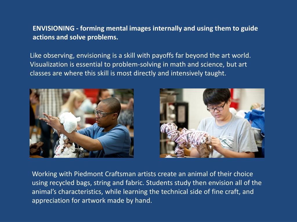 ENVISIONING - forming mental images internally and using them to guide actions and solve problems. Like observing, envisioning is a skill with payoffs far beyond the art world. Visualization is essential to problem-solving in math and science, but art classes are where this skill is most directly and intensively taught. Working with Piedmont Craftsman artists create an animal of their choice using recycled bags, string and fabric. Students study then envision all of the animal’s characteristics, while learning the technical side of fine craft, and appreciation for artwork made by hand.