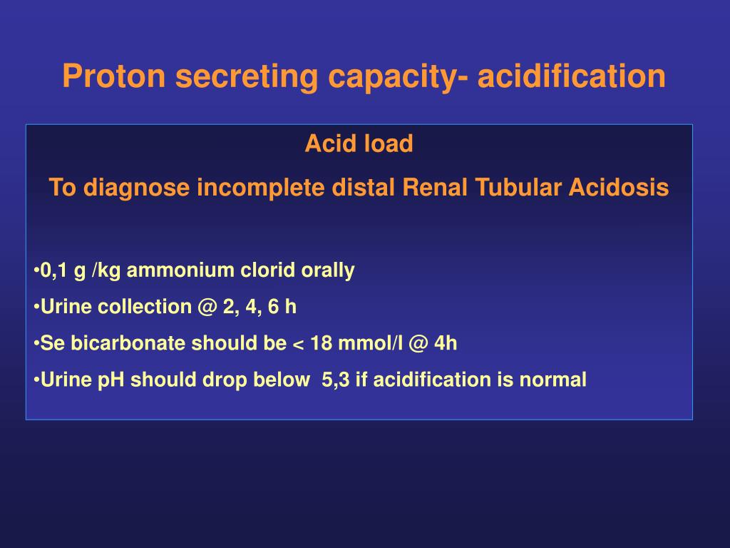 Proton secreting capacity- acidification • Acid load • To diagnose incomplete distal Renal Tubular Acidosis • 0,1 g /kg ammonium clorid orally • Urine collection @ 2, 4, 6 h • Se bicarbonate should be < 18 mmol/l @ 4h • Urine pH should drop below 5,3 if acidification is normal