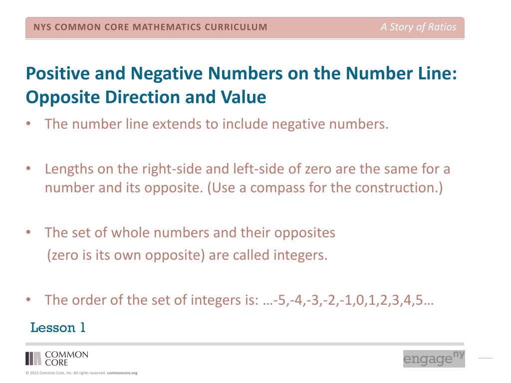 Positive and Negative Numbers on the Number Line: Opposite Direction and Value Lesson 1 • The number line extends to include negative numbers. • Lengths on the right-side and left-side of zero are the same for a number and its opposite. (Use a compass for the construction.) • The set of whole numbers and their opposites • (zero is its own opposite) are called integers. • The order of the set of integers is: …-5,-4,-3,-2,-1,0,1,2,3,4,5…