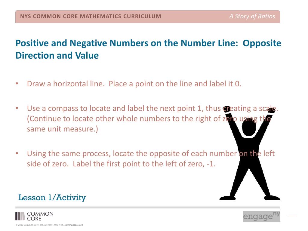 Positive and Negative Numbers on the Number Line: Opposite Direction and Value Lesson 1/Activity • Draw a horizontal line. Place a point on the line and label it 0. • Use a compass to locate and label the next point 1, thus creating a scale. (Continue to locate other whole numbers to the right of zero using the same unit measure.) • Using the same process, locate the opposite of each number on the left side of zero. Label the first point to the left of zero, -1.