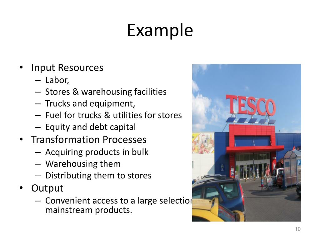 Example • Input Resources • Labor, • Stores & warehousing facilities • Trucks and equipment, • Fuel for trucks & utilities for stores • Equity and debt capital • Transformation Processes • Acquiring products in bulk • Warehousing them • Distributing them to stores • Output • Convenient access to a large selection of mainstream products.