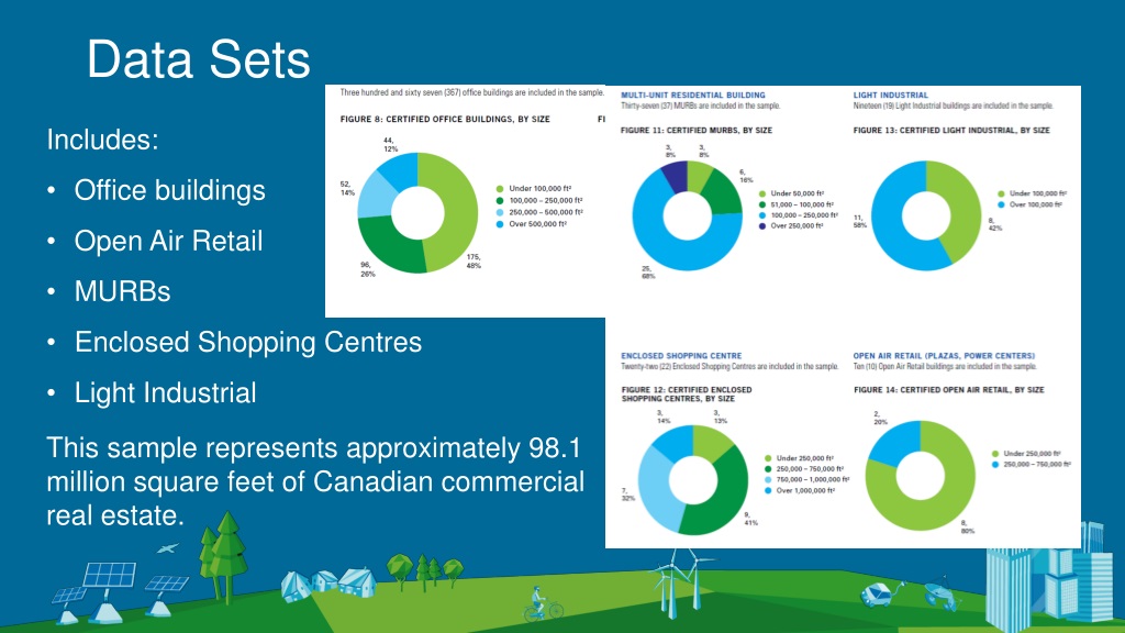 Data Sets • Includes: • Office buildings • Open Air Retail • MURBs • Enclosed Shopping Centres • Light Industrial • This sample represents approximately 98.1 million square feet of Canadian commercial real estate.