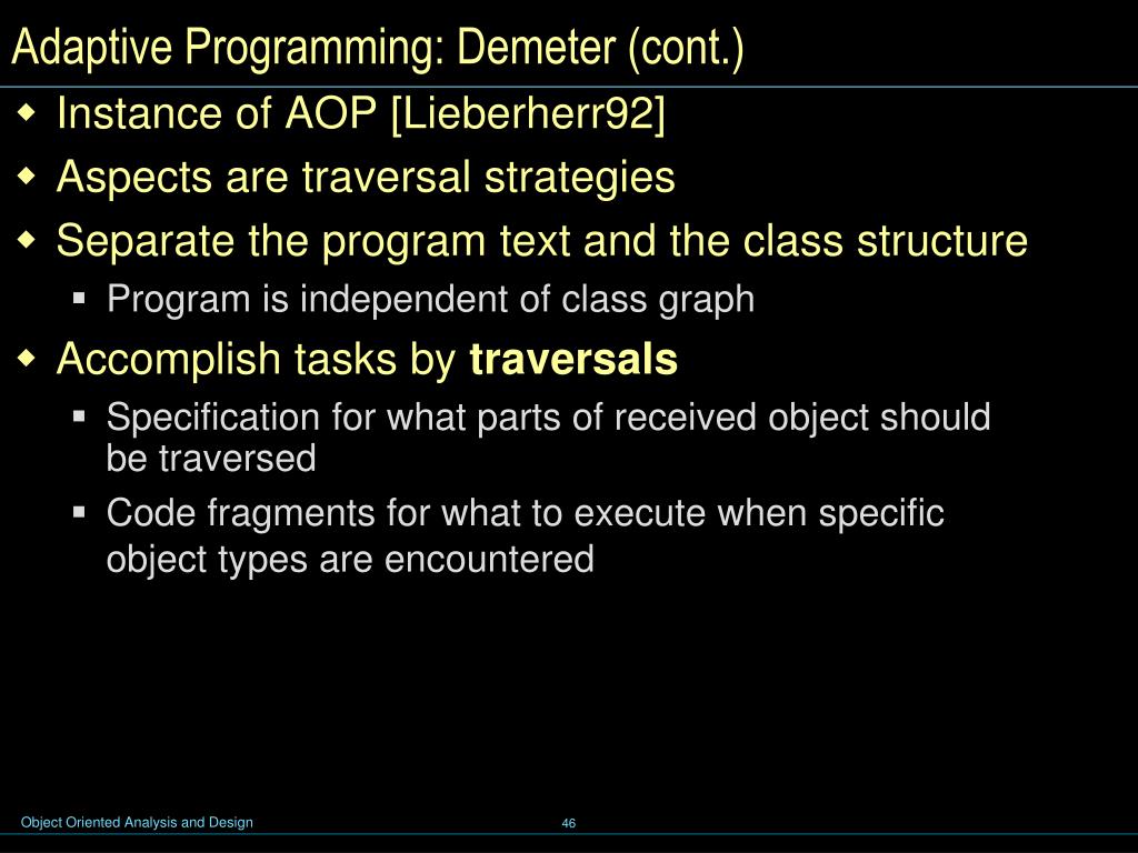 Adaptive Programming: Demeter (cont.) • Instance of AOP [Lieberherr92] • Aspects are traversal strategies • Separate the program text and the class structure • Program is independent of class graph • Accomplish tasks by traversals • Specification for what parts of received object should be traversed • Code fragments for what to execute when specific object types are encountered