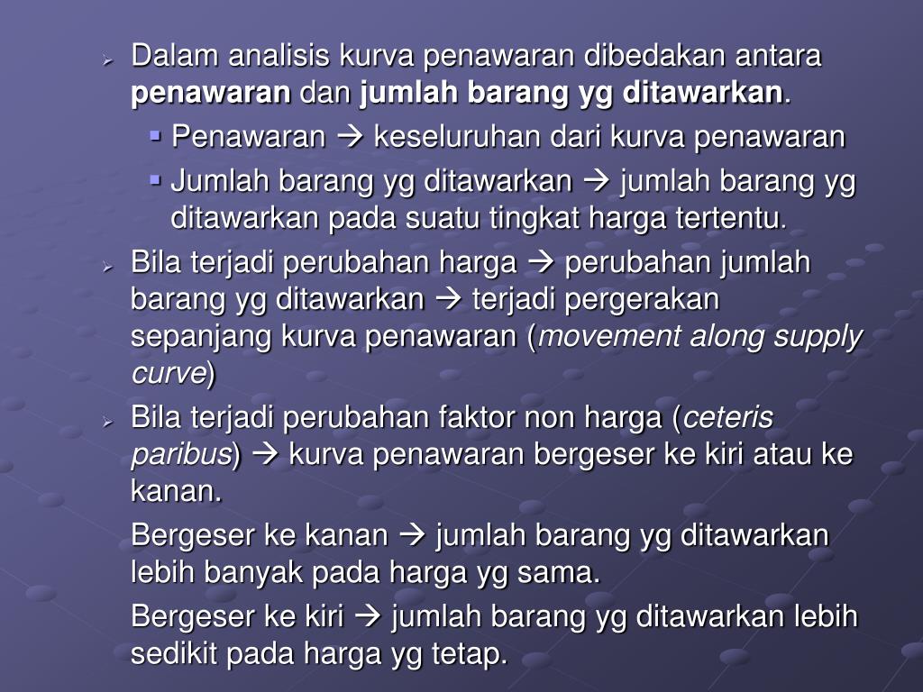 Dalam analisis kurva penawaran dibedakan antara penawaran dan jumlah barang yg ditawarkan. • Penawaran keseluruhan dari kurva penawaran • Jumlah barang yg ditawarkan jumlah barang yg ditawarkan pada suatu tingkat harga tertentu. • Bila terjadi perubahan harga perubahan jumlah barang yg ditawarkan terjadi pergerakan sepanjang kurva penawaran (movement along supply curve) • Bila terjadi perubahan faktor non harga (ceteris paribus) kurva penawaran bergeser ke kiri atau ke kanan. Bergeser ke kanan jumlah barang yg ditawarkan lebih banyak pada harga yg sama. Bergeser ke kiri jumlah barang yg ditawarkan lebih sedikit pada harga yg tetap.