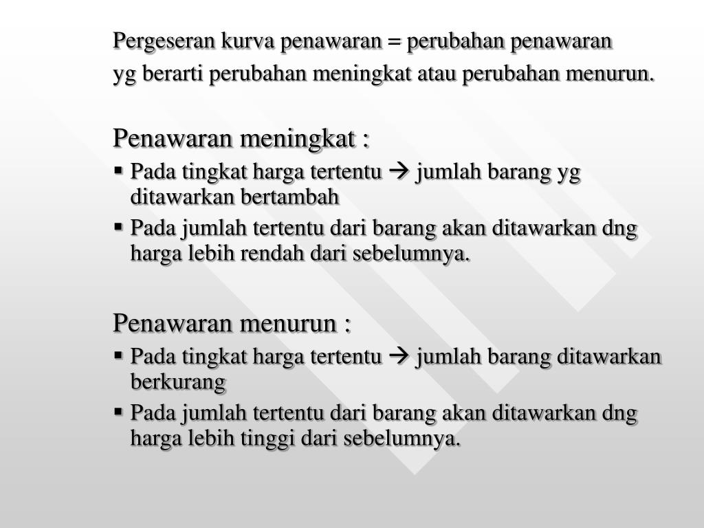 Pergeseran kurva penawaran = perubahan penawaran yg berarti perubahan meningkat atau perubahan menurun. Penawaran meningkat : • Pada tingkat harga tertentu jumlah barang yg ditawarkan bertambah • Pada jumlah tertentu dari barang akan ditawarkan dng harga lebih rendah dari sebelumnya. Penawaran menurun : • Pada tingkat harga tertentu jumlah barang ditawarkan berkurang • Pada jumlah tertentu dari barang akan ditawarkan dng harga lebih tinggi dari sebelumnya.