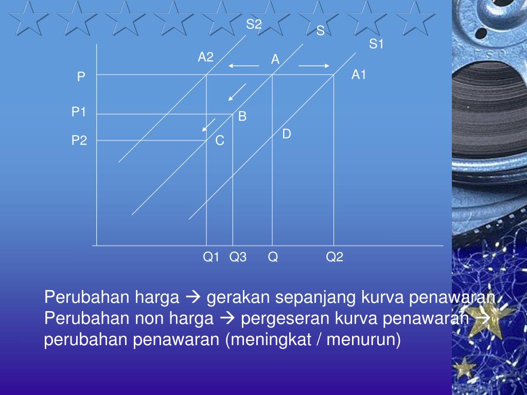S2 S S1 A2 A A1 P P1 B D P2 C Q1 Q3 Q Q2 Perubahan harga gerakan sepanjang kurva penawaran Perubahan non harga pergeseran kurva penawaran perubahan penawaran (meningkat / menurun)